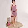 Γυναικείο βαμβακερό σετ ύπνου μπορντω ριγέ. Σορτς με λάστιχο στη μεση και δαντέλα στο τελειωμα. Φανελάκι με δαντέλα στο μπούστο. Στενή εφαρμογή. Σύνθεση βαμβάκι95% ελασταν 5%